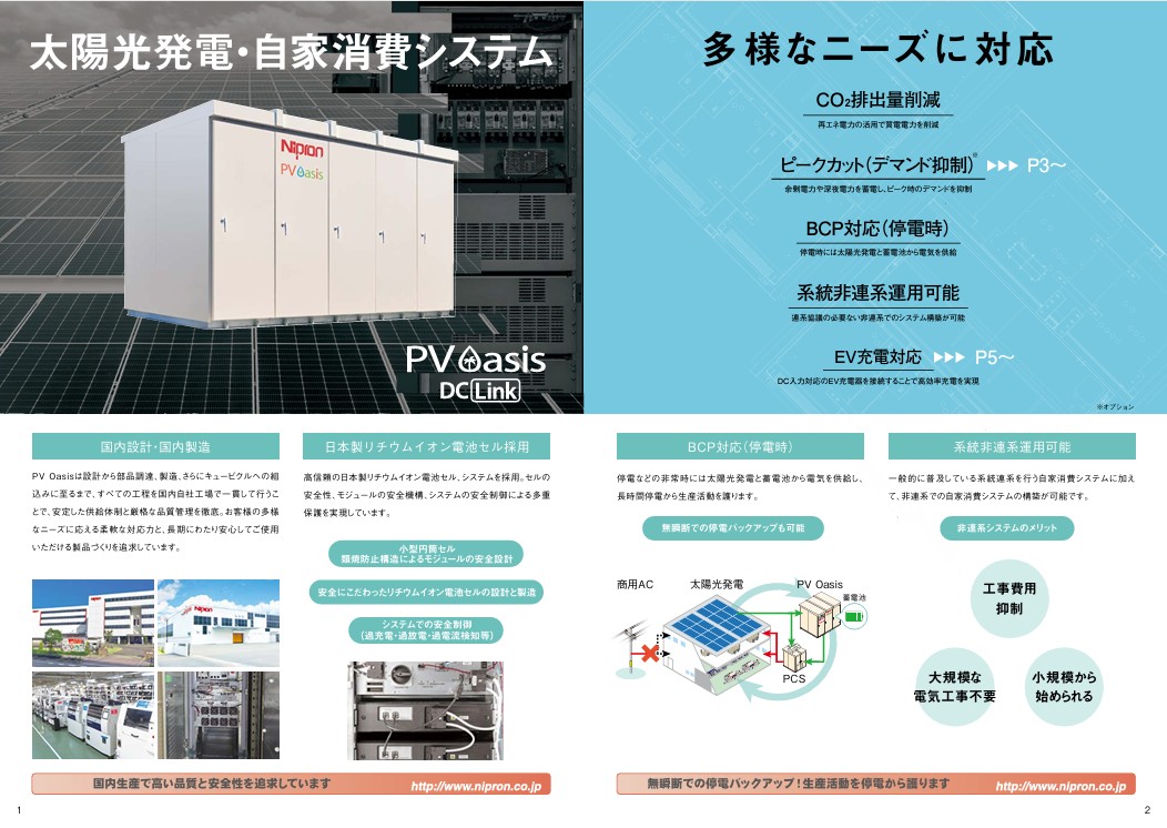 蓄電池や充放電システムなどを組み合わせた、太陽光発電・自家消費システム「PV Oasis」の特長を掲載しています。