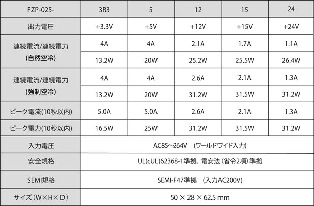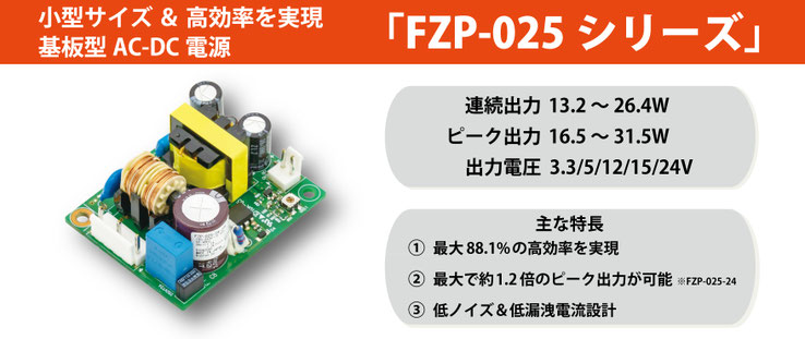 「FZP-025シリーズ」は、連続最大26.4W・ピーク最大31.5W出力が可能な電源です。