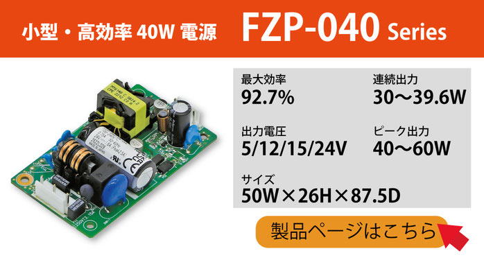 同シリーズでは、小型・高効率の40W電源として「FZP-040シリーズ」をラインアップしています。