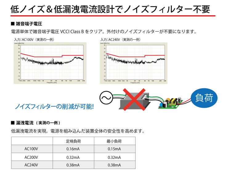 低ノイズ&低漏洩電流設計を実現しており、電源単体で雑音端子電圧VCCI Class Bをクリア。