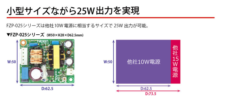 FZP-025シリーズは、他社10W電源に相当するサイズで25W出力が可能です。